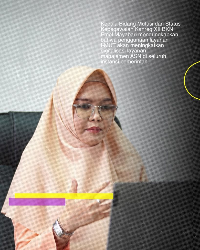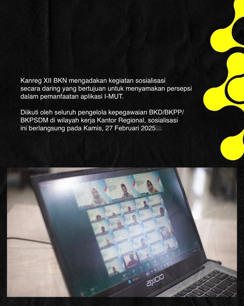 Kantor Regional XII Badan Kepegawaian Negara (BKN) menggelar kegiatan sosialisasi penggunaan layanan Integrated Mutasi (I-MUT) secara daring, Kamis 27 Februari 2025. Kegiatan ini bertujuan menyamakan persepsi seluruh pengelola kepegawaian daerah dalam penerapan aplikasi I-MUT sebagai instrumen pengawasan dan pengendalian mutasi ASN.