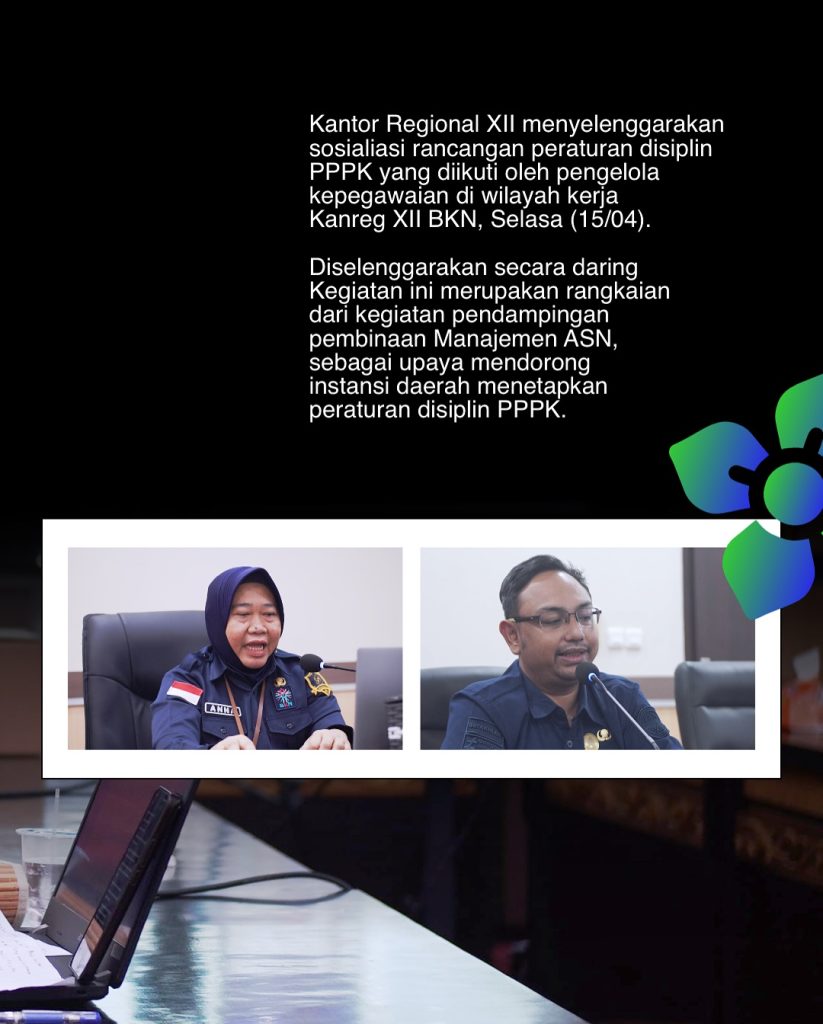 Kantor Regional XII Badan Kepegawaian Negara menyelenggarakan sosialisasi rancangan peraturan disiplin bagi Pegawai Pemerintah dengan Perjanjian Kerja (PPPK) yang diikuti pengelola kepegawaian di wilayah kerja Kanreg XII BKN. Kegiatan yang digelar secara daring pada Selasa (15/04) ini menjadi bagian dari rangkaian pendampingan pembinaan Manajemen ASN untuk mendorong instansi daerah segera menetapkan regulasi disiplin PPPK secara seragam dan terukur.