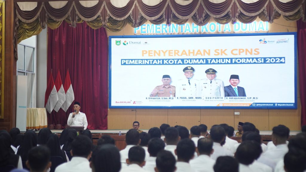 Pemerintah Kota Dumai secara resmi menyerahkan Surat Keputusan (SK) Pengangkatan kepada 266 Calon Pegawai Negeri Sipil (CPNS) formasi tahun 2024 yang dilaksanakan di Gedung Sri Bunga Tanjung pada Selasa (27/05).