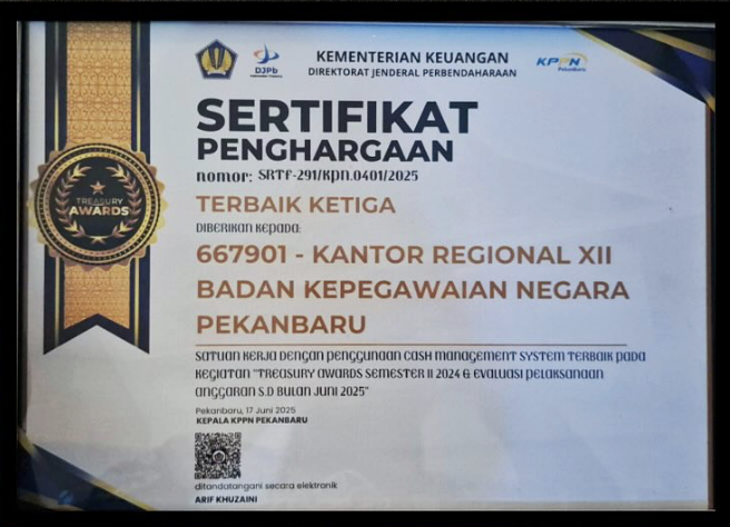 Kantor Regional XII Badan Kepegawaian Negara (BKN) Pekanbaru kembali mencatatkan prestasi dengan meraih peringkat ke-3 dalam kategori digitalisasi pembayaran sebagai satuan kerja dengan penggunaan Cash Management System (CMS) terbaik. Penghargaan tersebut diberikan oleh Kantor Pelayanan Perbendaharaan Negara (KPPN) Pekanbaru dalam kegiatan Treasury Awards Semester II 2024 dan Evaluasi Pelaksanaan Anggaran, yang dilaksanakan pada Kamis (19/06) di Aula Lancang Kuning, Kanwil DJPb Provinsi Riau.