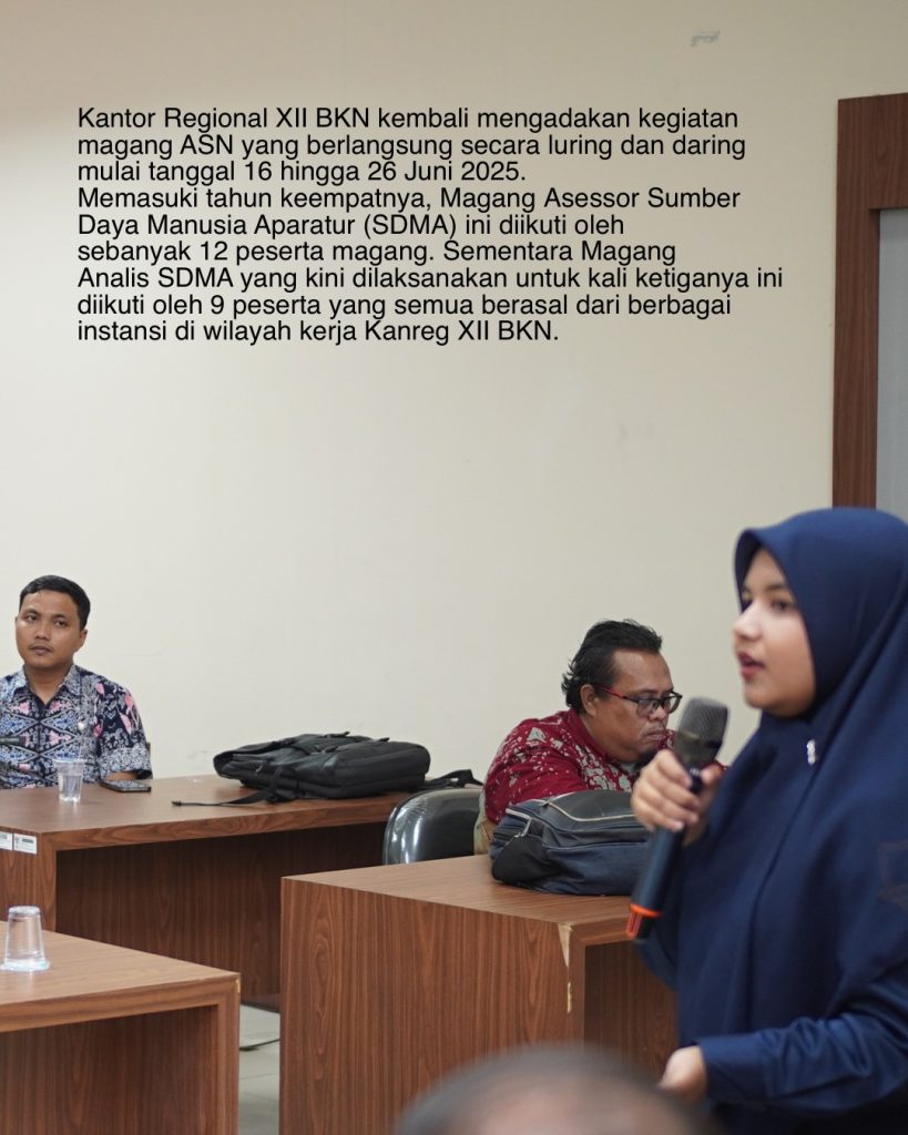 Program magang ASN yang diselenggarakan oleh Kanreg XII BKN kembali berlangsung sebagai upaya meningkatkan kemampuan dan profesionalisme aparatur. Kegiatan ini dilaksanakan secara luring dan daring pada 16–26 Juni 2025 dan diikuti oleh 21 peserta yang berasal dari berbagai instansi di wilayah kerja Kanreg XII.