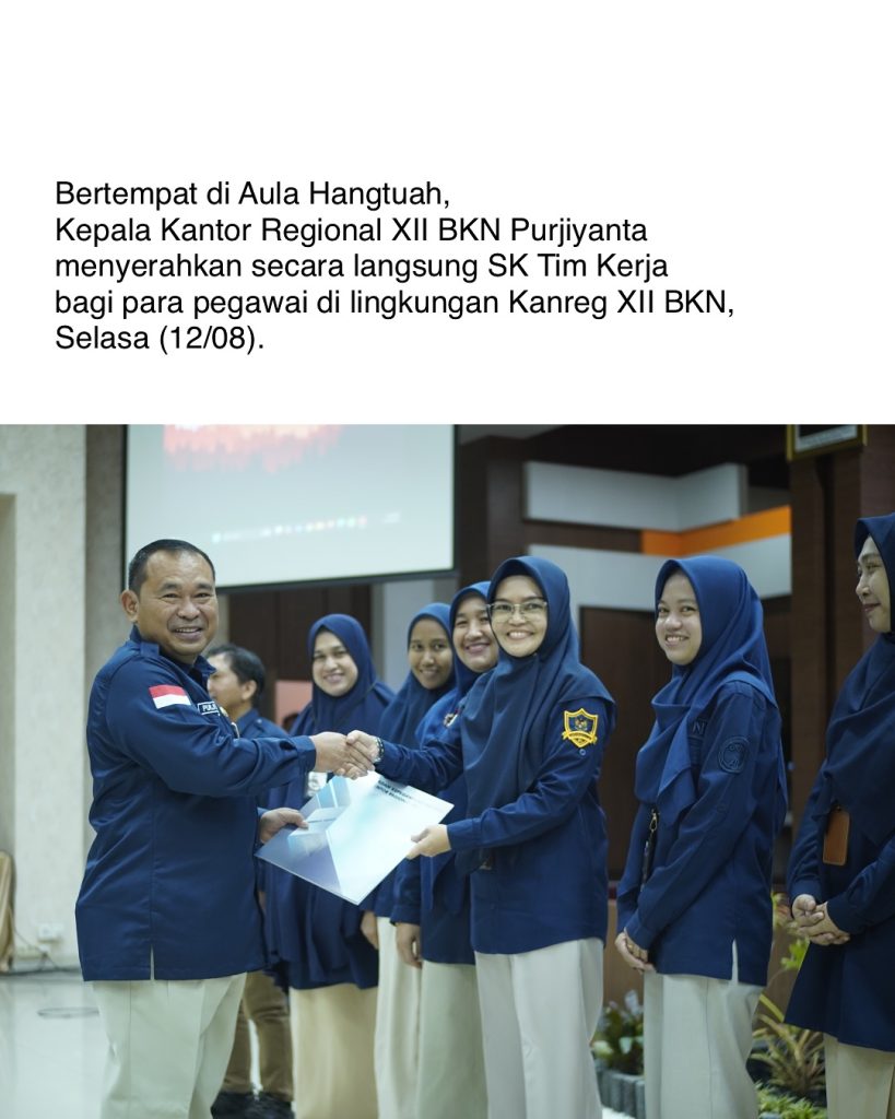 Kantor Regional XII Badan Kepegawaian Negara menetapkan Tim Kerja bagi seluruh pegawai sebagai langkah memperkuat tata kelola dan kualitas layanan kepegawaian. Penyerahan Surat Keputusan dilaksanakan di Aula Hangtuah dan dipimpin langsung oleh Kepala Kanreg XII BKN Purjiyanta, Selasa (12/08).