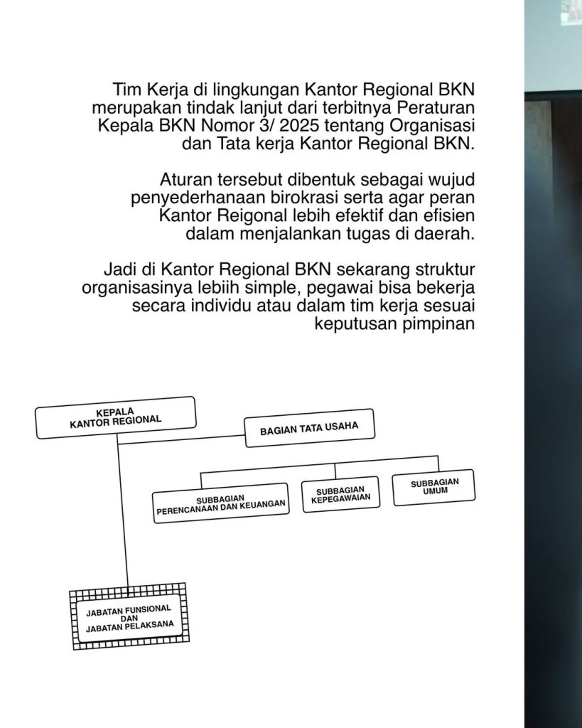 Penetapan Tim Kerja ini merupakan tindak lanjut dari Peraturan Kepala BKN Nomor 3 Tahun 2025, yang mengatur penyederhanaan organisasi dan tata kerja Kantor Regional BKN. Aturan tersebut mendorong struktur organisasi yang lebih sederhana, efektif, dan memungkinkan pegawai bekerja secara individu maupun dalam tim sesuai arahan pimpinan.