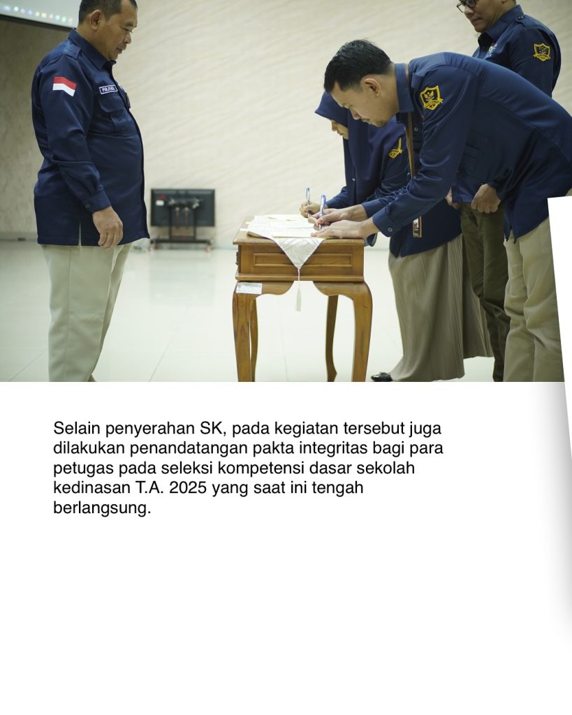 Selain penetapan Tim Kerja, kegiatan turut diisi dengan penandatanganan pakta integritas bagi para petugas seleksi kompetensi dasar sekolah kedinasan Tahun Anggaran 2025 yang sedang berlangsung. Penandatanganan ini menjadi bentuk komitmen bersama untuk menjunjung profesionalitas dan akuntabilitas dalam setiap tahapan penyelenggaraan seleksi.