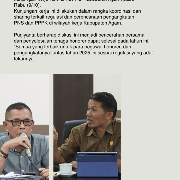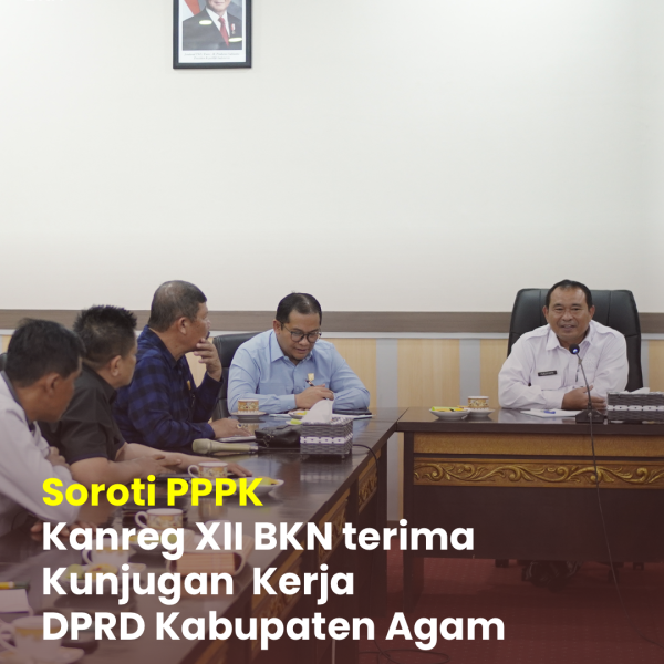 Kepala Kanreg XII BKN, Purjiyanta beserta jajaran menerima kunjungan kerja Komisi I DPRD Kabupaten Agam, pada Rabu (10/9). Kunjungan kerja ini dilakukan dalam rangka koordinasi dan sharing terkait regulasi dan perencanaan pengangkatan PNS dan PPPK di wilayah kerja Kabupaten Agam.
