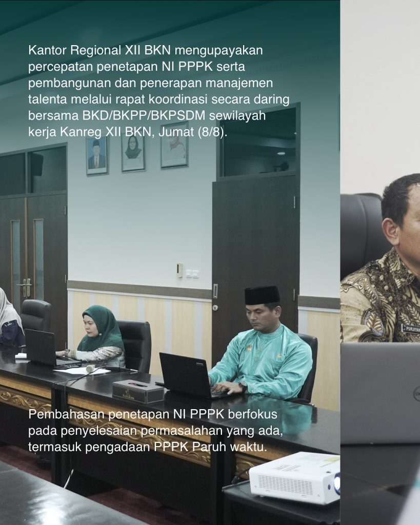 Kantor Regional XII BKN terus bergerak agresif dalam menuntaskan agenda prioritas manajemen kepegawaian nasional. Melalui rapat koordinasi daring yang digelar pada Jumat (8/8), Kanreg XII BKN menekankan dua fokus utama kepada seluruh instansi di wilayah kerjanya: percepatan penetapan Nomor Induk (NI) Pegawai Pemerintah dengan Perjanjian Kerja (PPPK) dan implementasi Manajemen Talenta.