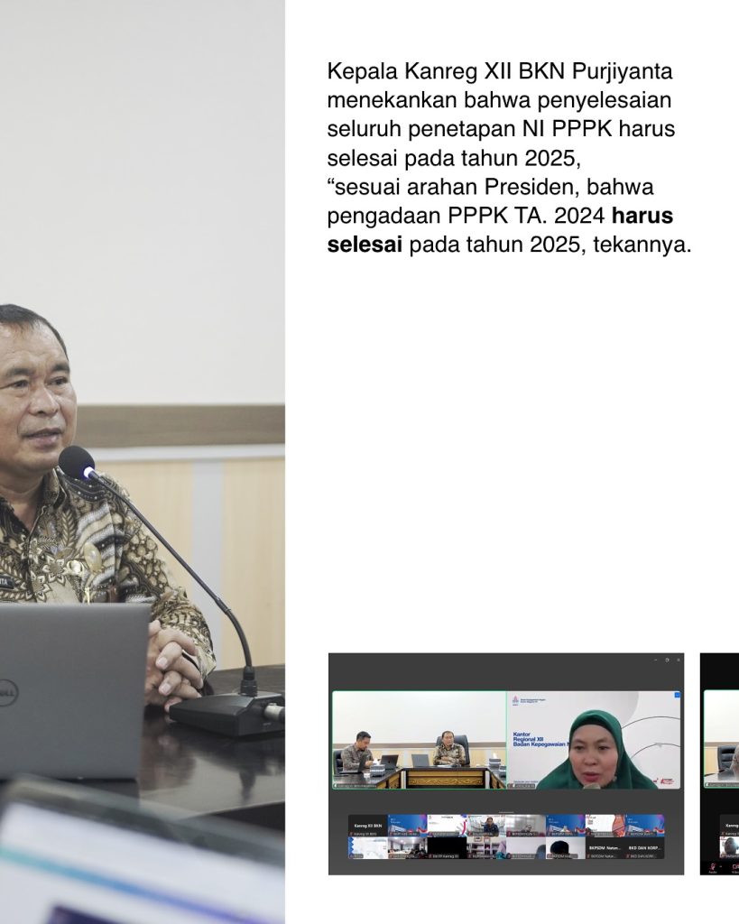 “Sesuai arahan Presiden, pengadaan PPPK TA 2024 harus selesai pada tahun 2025. Tidak ada penundaan lagi,” tegas Purjiyanta di hadapan perwakilan BKD, BKPP, dan BKPSDM se-wilayah kerja Kanreg XII BKN.
