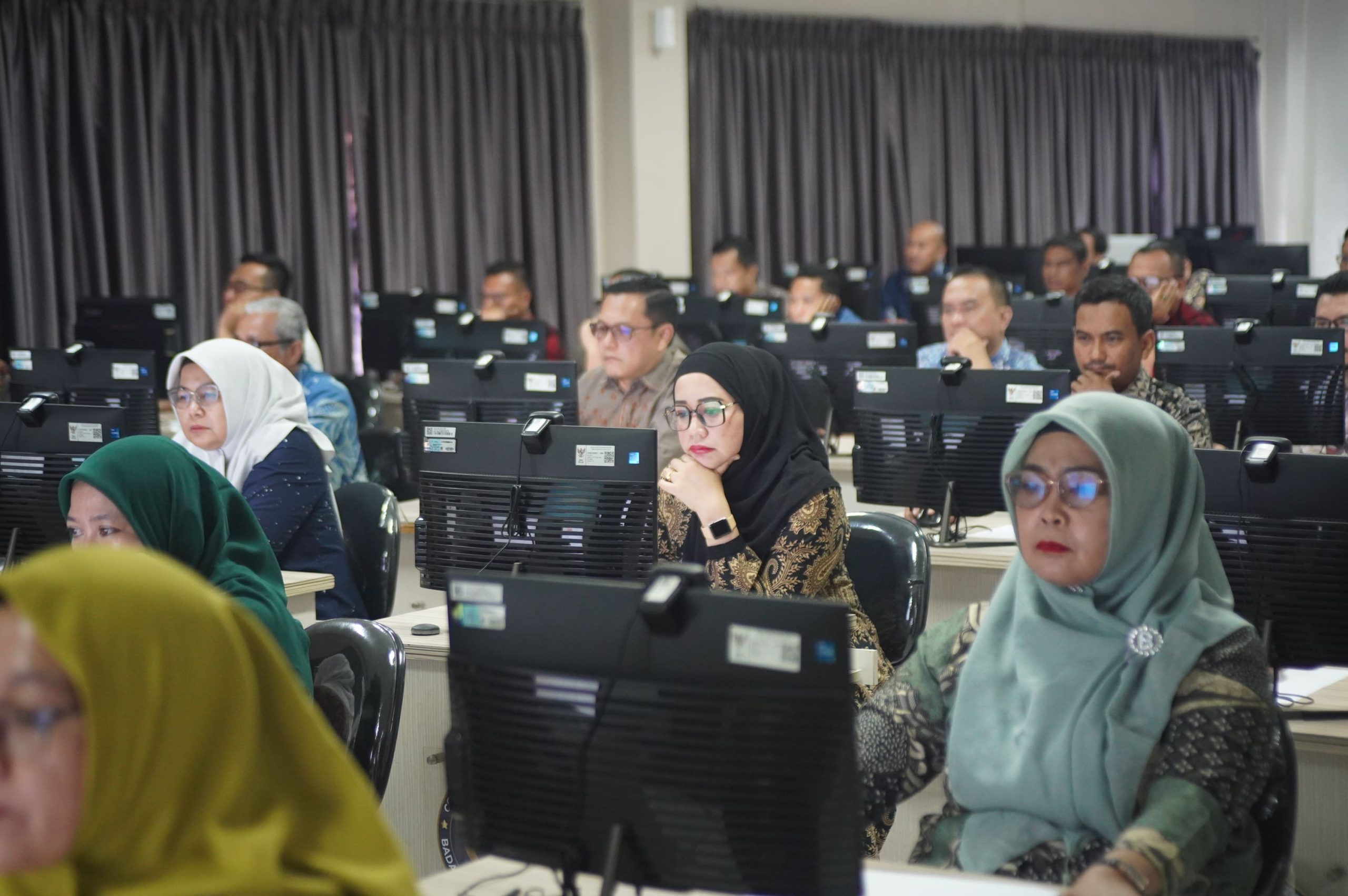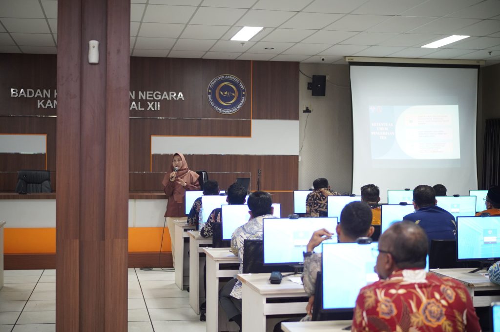 Di ruang tes, peserta tampak mengikuti asesmen dengan serius, didampingi tim teknis Kanreg XII BKN yang memantau kelancaran pelaksanaan dari sisi infrastruktur, validasi peserta, hingga mekanisme pengerjaan. Seluruh rangkaian kegiatan disiapkan untuk menjamin proses berjalan tertib, objektif, dan sesuai pedoman resmi ProASN.